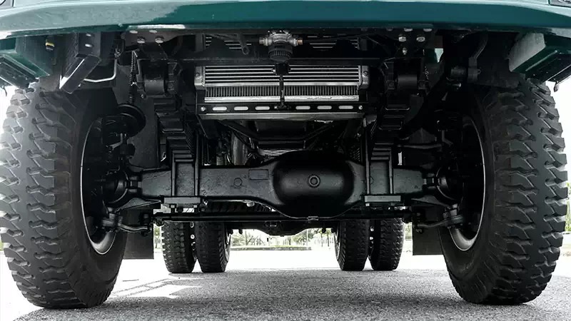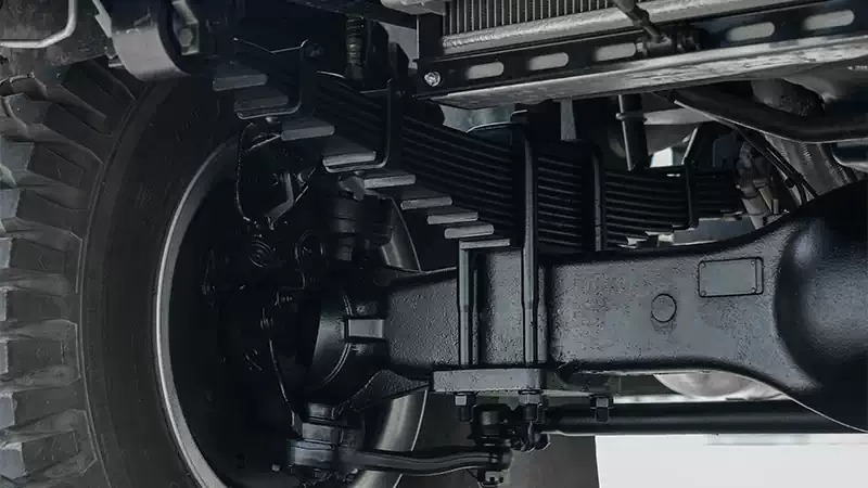 Hệ thống treo trước sử dụng nhíp lá (10 lá) kết hợp giảm chấn thủy lực, giúp dập tắt dao động nhanh, vận hành êm dịu