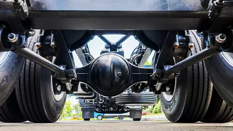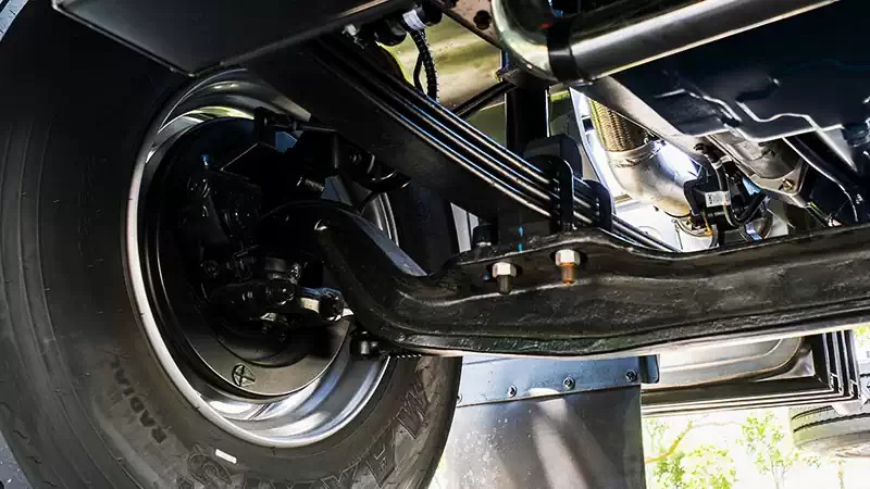Treo sau nhíp lá (05 lá) 2 tầng kết hợp giảm chấm thủy lực khả năng chịu tải cao.